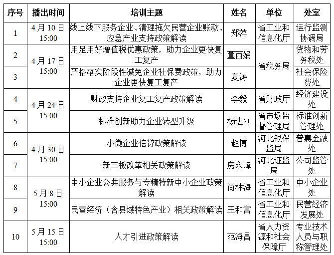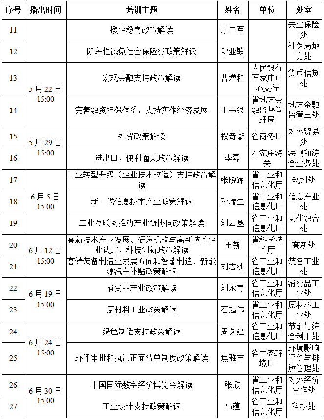 培训内容:主要包括增值税优惠、财政支持复工复产、小微企业信贷、人才引进、宏观金融、企业转型升级、高端高新产业、绿色制造、环评审批和执法负面清单制度等方面政策。具体每期培训活动安排如下表: