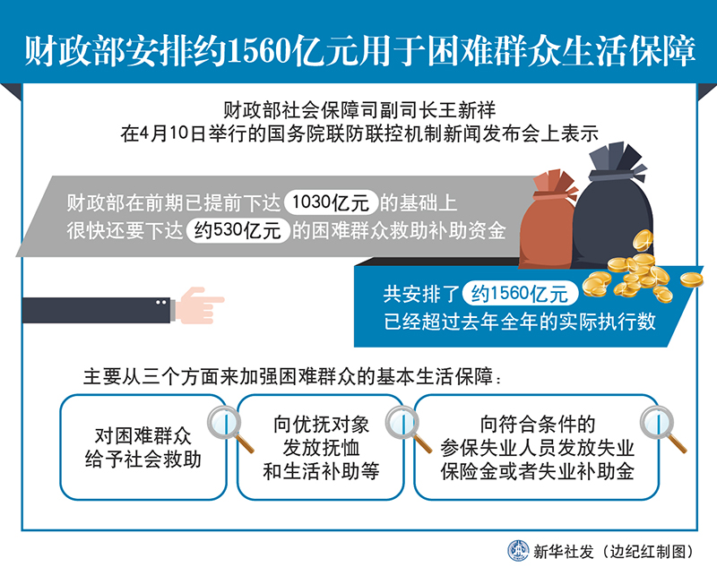新华社北京4月10日电(记者张泉、伍岳)财政部社会保障司副司长王新祥在10日举行的国务院联防联控机制新闻发布会上表示,财政部在前期已提前下达1030亿元的基础上,很快还要下达约530亿元的困难群众救助补助资金,共安排了约1560亿元,已经超过去年全年的实际执行数。