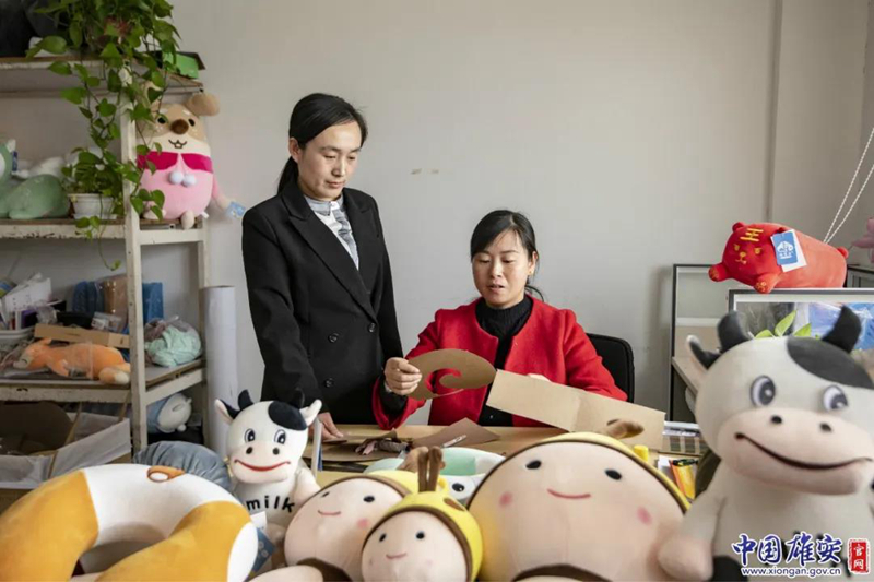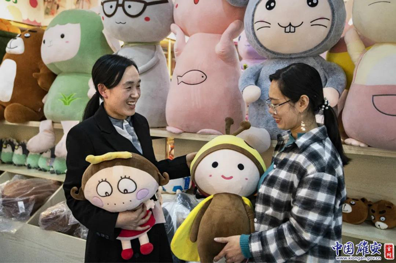 康静:4月2日,第二天(我)就从兴奋中转换过来了,我们就开始着眼于调研,去了解新区的发展、规划、定位,结合自身的毛绒玩具产品,(思考)我们要怎么做?2017年5月份,我们制定了(新的)方针政策,我们要树品牌,我们要做自己的品牌,不能再做生产加工了。首先,我们要组建团队,把比较知名的设计师请过来,和我们一起组建了团队。从手稿的设计到电子稿的出品,加上产品的制作,整个流程出来了还是蛮开心的,感觉自己小有成就,把我们也倒逼了一把。