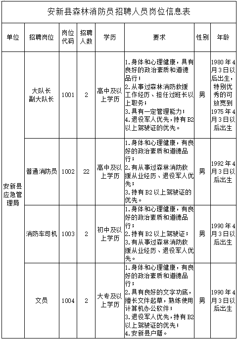 森林消防救援队大队长1名、副大队长1名、森林消防救援队员22名、消防车司机2名、森林消防救援队文员2名,详情见(附件:招聘人员岗位信息表)。