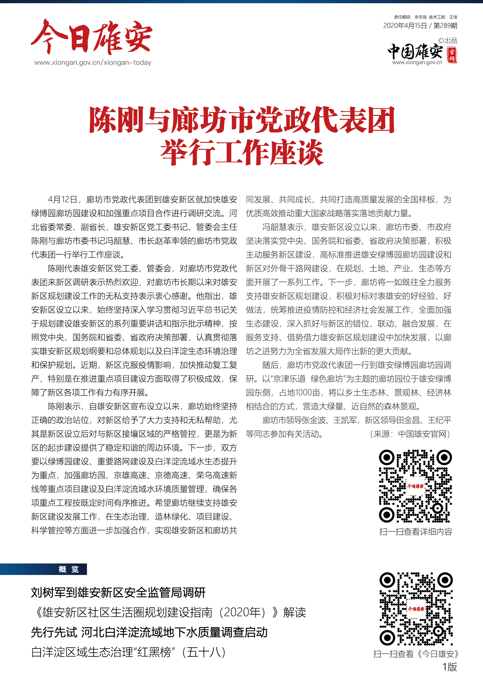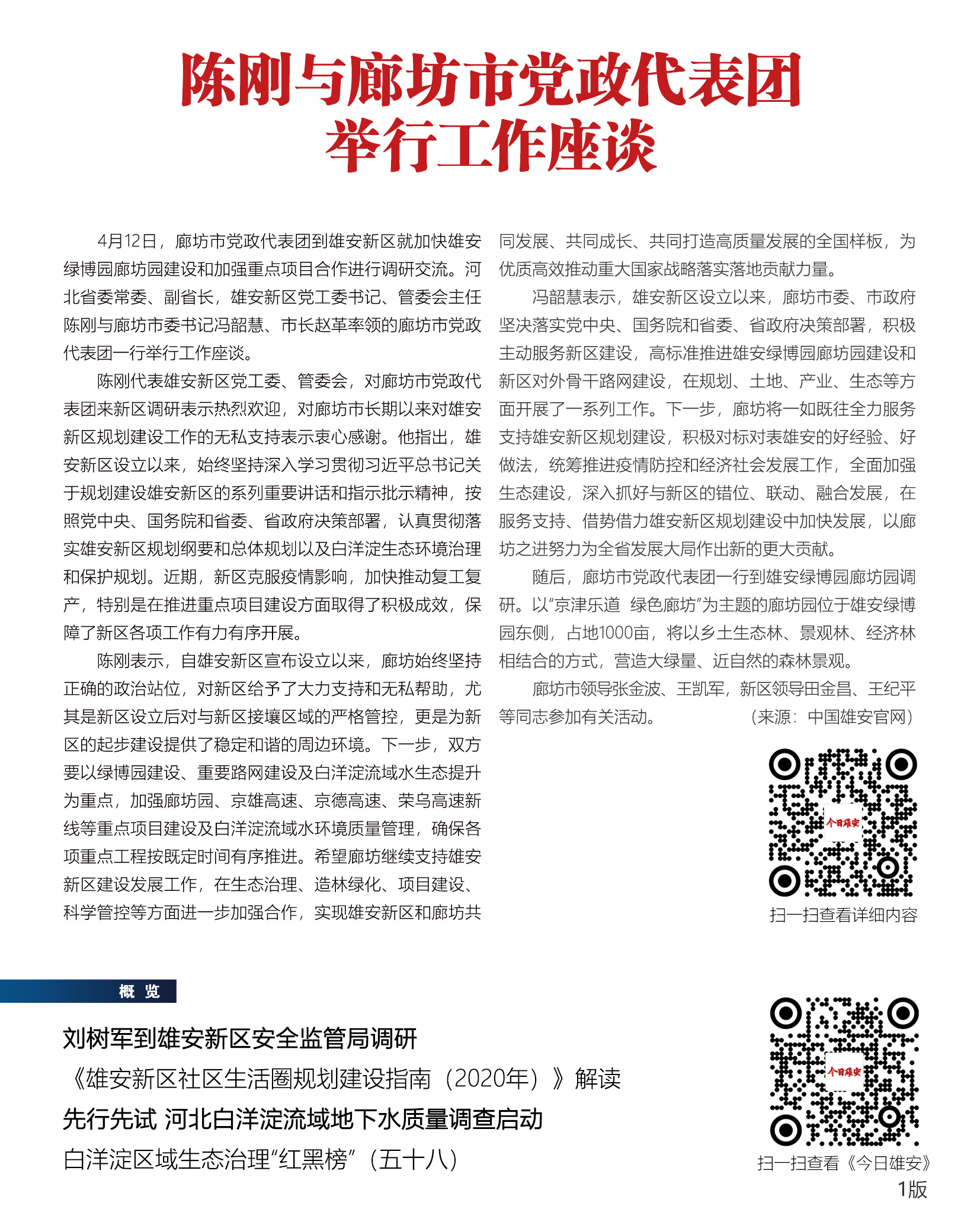 4月12日,廊坊市党政代表团到雄安新区就加快雄安绿博园廊坊园建设和加强重点项目合作进行调研交流。