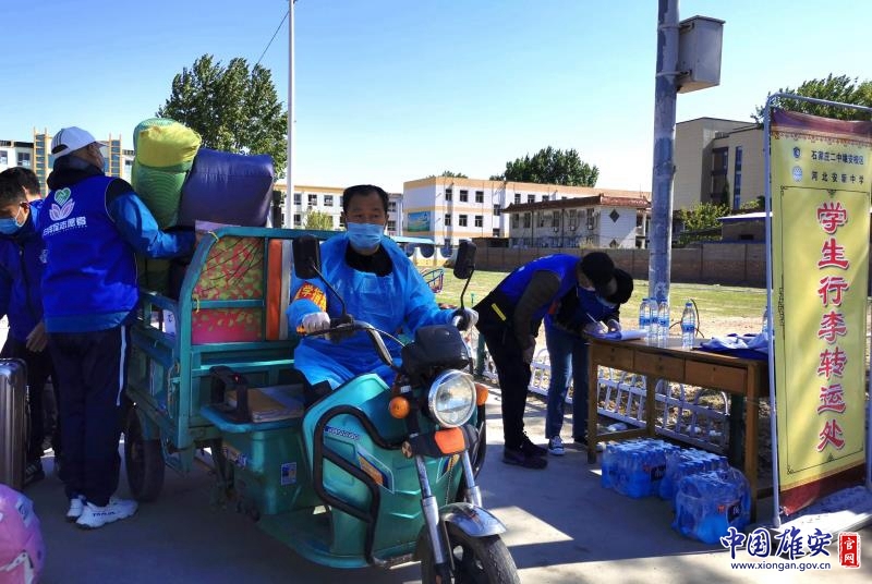 石家庄二中雄安校区河北安新中学工作人员在接驳点为高三学生运送行李。中国雄安官网记者牛思佳 摄