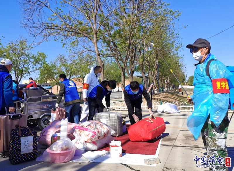 石家庄二中雄安校区河北安新中学工作人员正在为返校的高三学生进行行李消毒。中国雄安官网记者牛思佳 摄