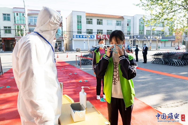 雄县中学学生入校前更换口罩。中国雄安官网记者毛鹤然 摄