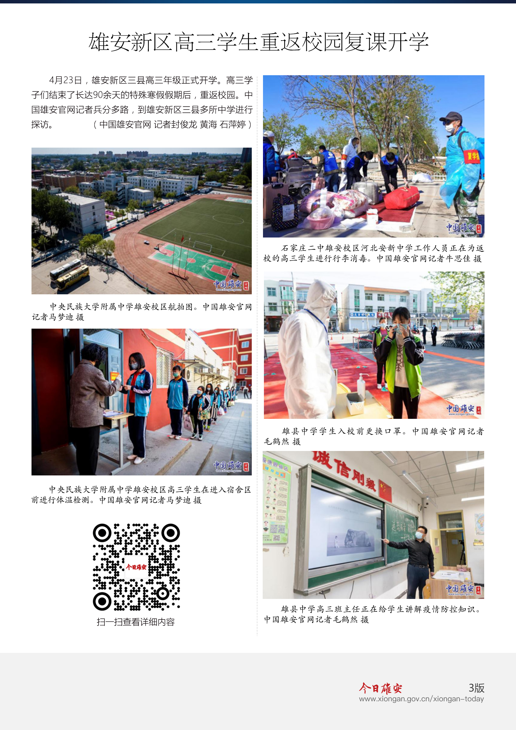 4月23日,雄安新区三县高三年级正式开学。高三学子们结束了长达90余天的特殊寒假假期后,重返校园。