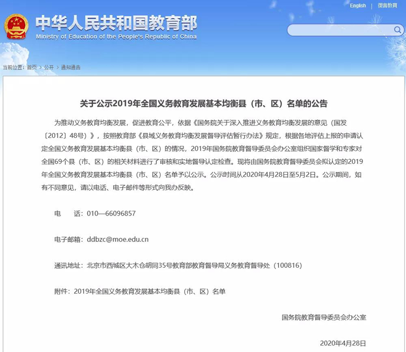 近日,国务院教育督导委员会办公室发布公告,对拟认定的2019年全国义务教育发展基本均衡县(市、区)名单进行公示,其中河北8个↓↓↓