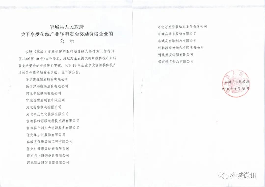 容城县人民政府关于享受传统产业转型资金奖励资格企业的公示