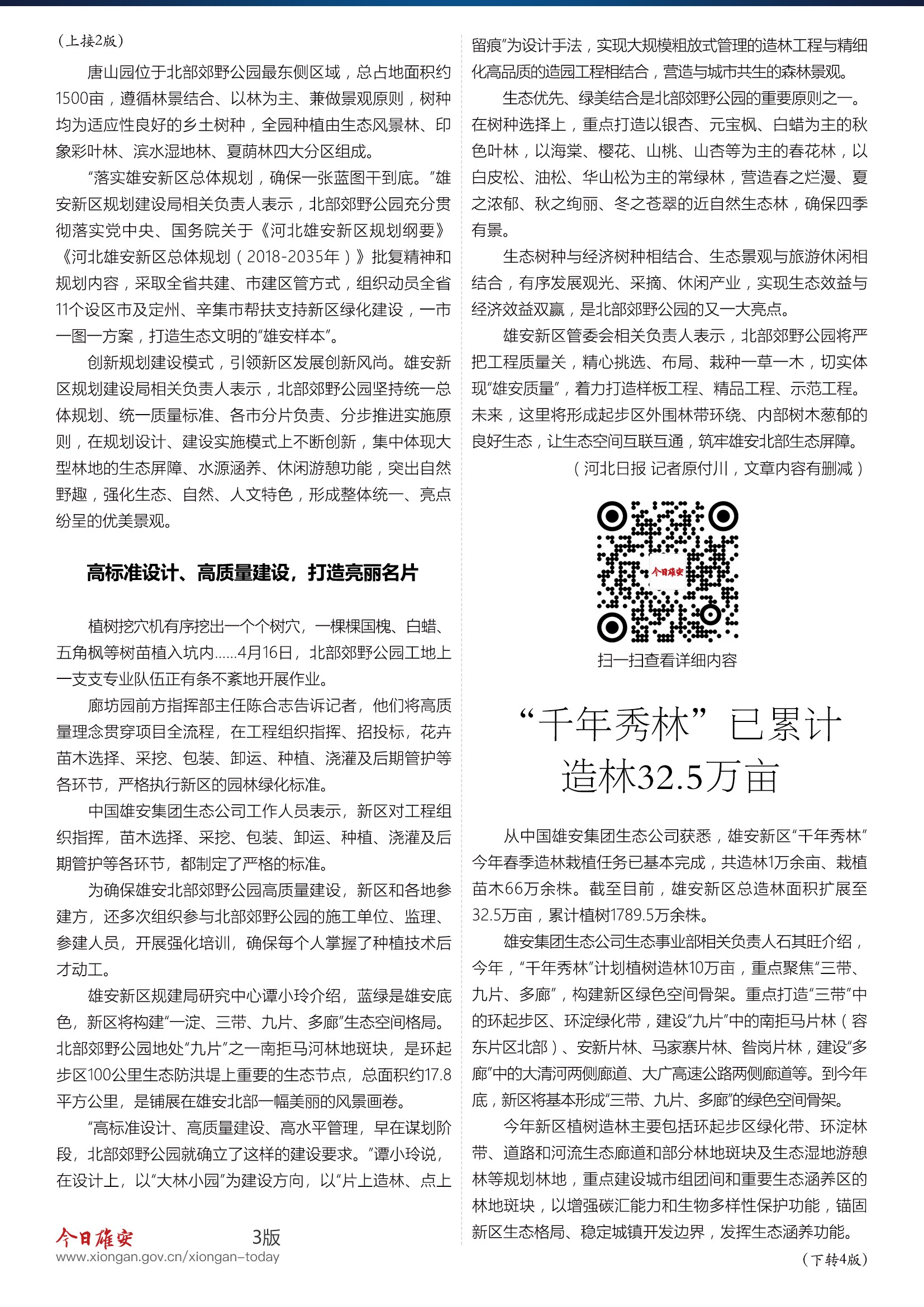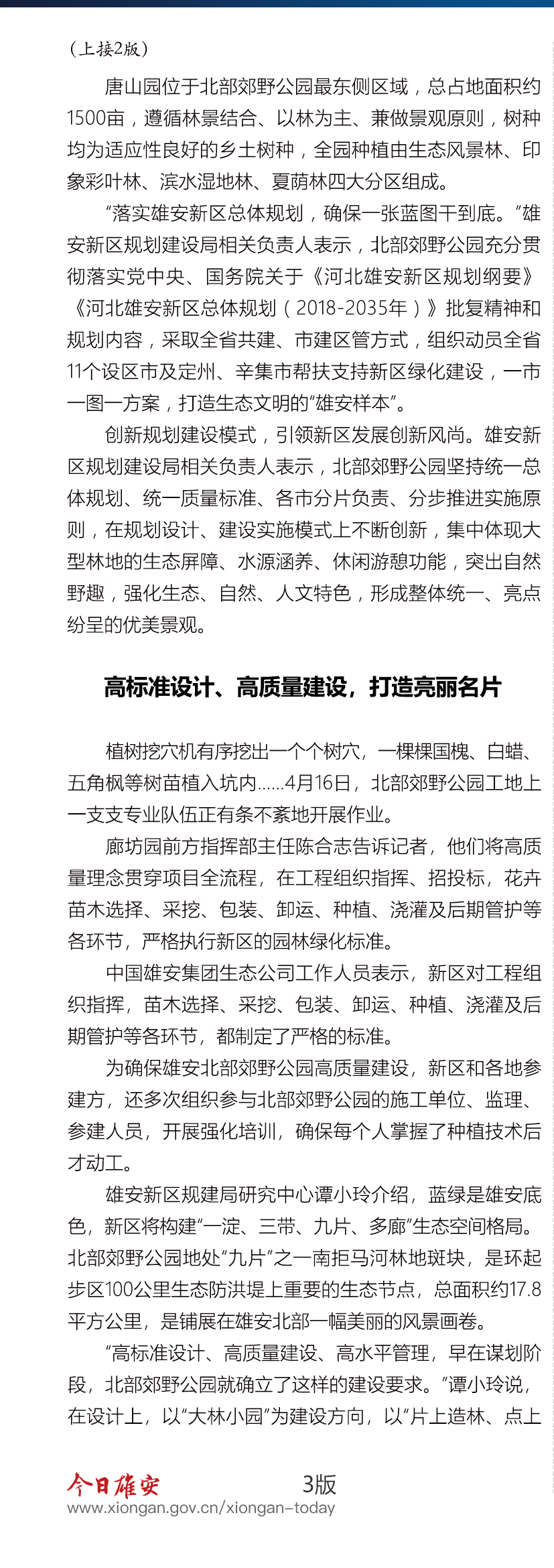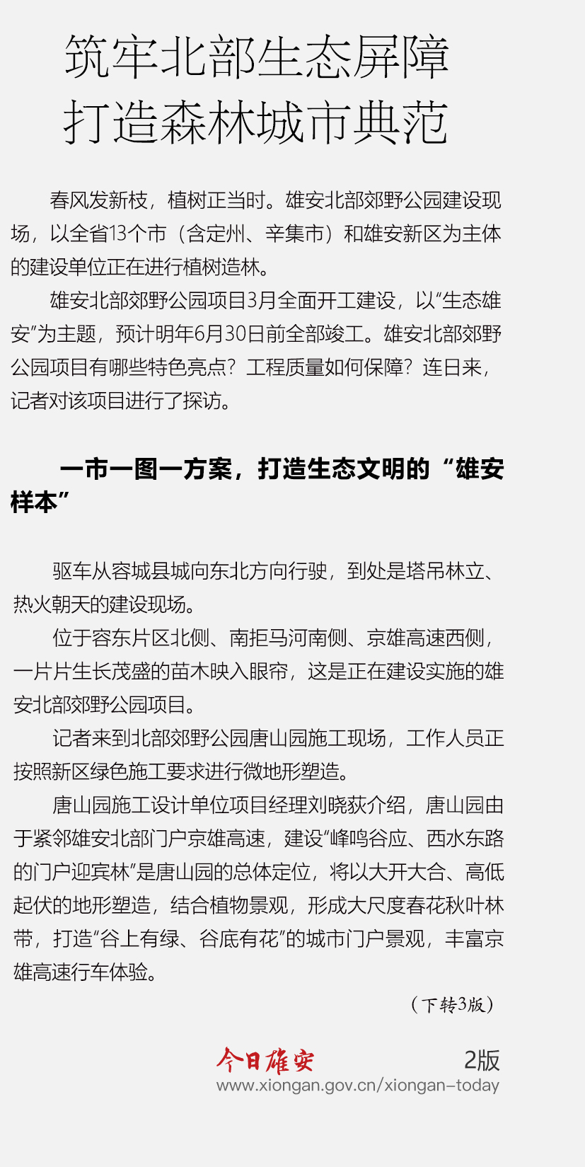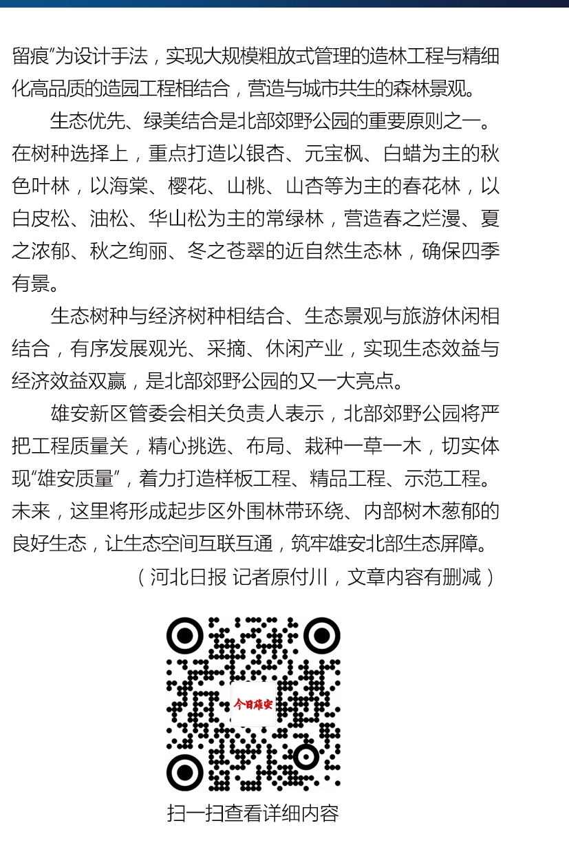 雄安北部郊野公园项目3月全面开工建设,以“生态雄安”为主题,预计明年6月30日前全部竣工。