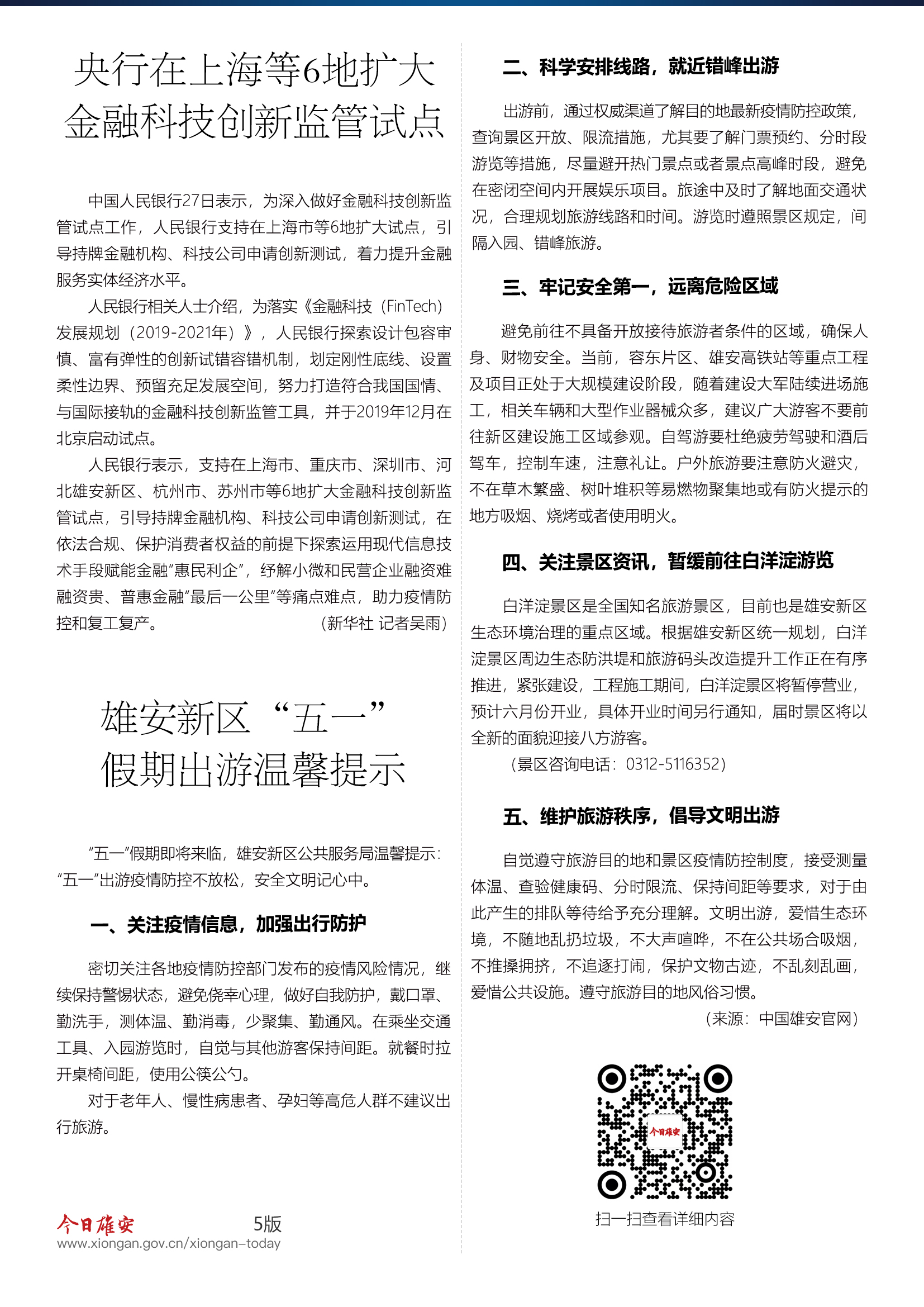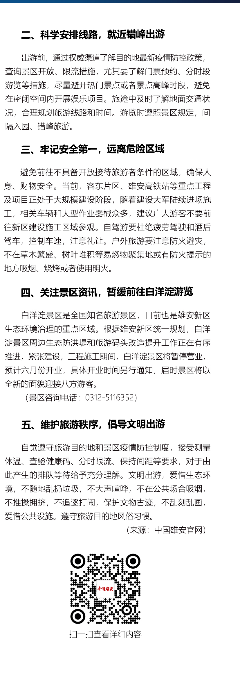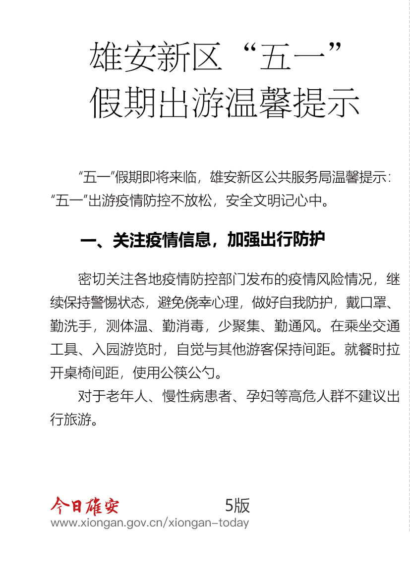 “五一”假期即将来临,雄安新区公共服务局温馨提示:“五一”出游疫情防控不放松,安全文明记心中。