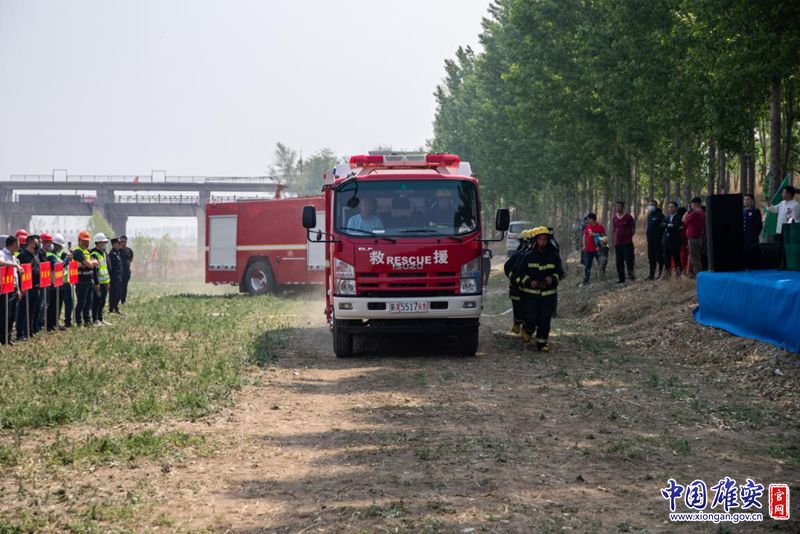 森林草原应急救援演练现场模拟了2050年4月28日“千年秀林”东侧既有林中突发森林火灾。火场面积南北长40多米、东西纵50多米,过火面积2000多平方米。图为救援车辆进入救援演练现场。中国雄安官网记者高盟 摄