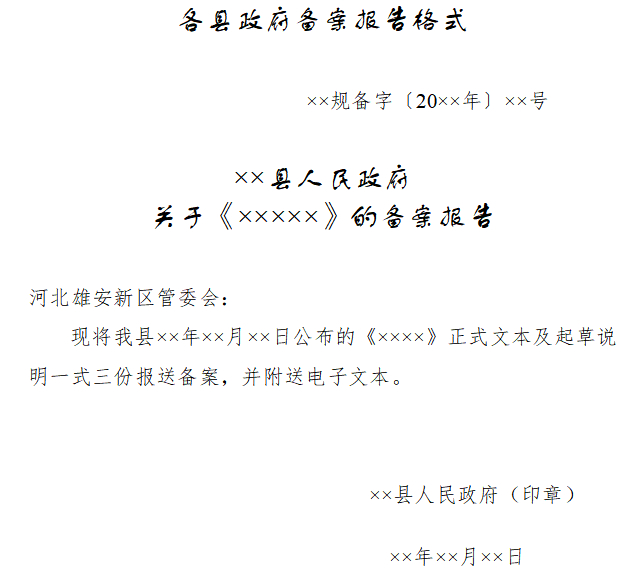 新区管委会、新区党政办公室印发的行政规范性文件,应当自公布之日起3日内由起草单位报送新区党群工作部,由新区党群工作部向河北省人民政府备案。各县政府印发的行政规范性文件应当自公布之日起15日内,向新区管委会备案。各县政府要明确具体承担规范性文件合法性备案工作的机构(以下统称“备案机构”)。新区党群工作部作为新区管委会的备案机构,负责审查各县政府印发的规范性文件;各县政府的备案机构负责报送备案各县印发的规范性文件。报送规范性文件备案,由各县备案机构径送新区党群工作部。新区党群工作部和各县应对现行有效的行政规范性文件及时进行清理,作出保留、修改或废止的决定,保证行政规范性文件不存在内容滞后、配套缺位、制度缺失等问题。各县政府行政规范性文件备案审查的程序,可参照上述规定作出具体规范。报送的备案审查材料,应当包括以下内容: