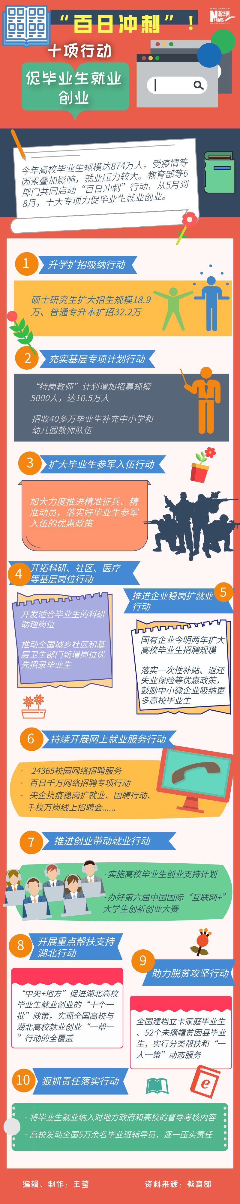今年高校毕业生规模达874万人,受新冠肺炎疫情等多种因素叠加影响,就业面临较大压力。日前,教育部等6部门共同启动“百日冲刺”行动,从5月份到8月中旬,十大专项力促毕业生就业创业。