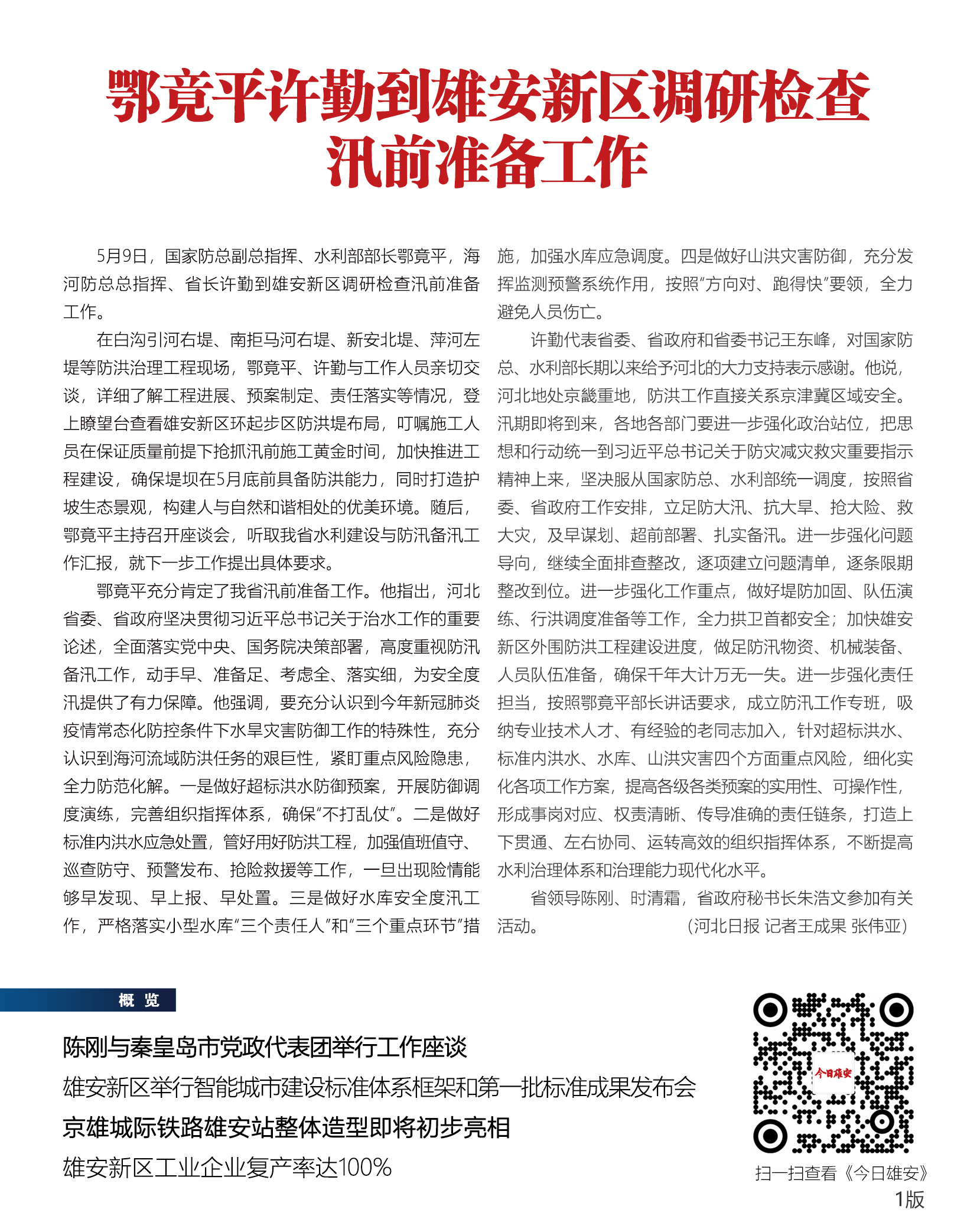 5月9日,国家防总副总指挥、水利部部长鄂竟平,海河防总总指挥、省长许勤到雄安新区调研检查汛前准备工作。