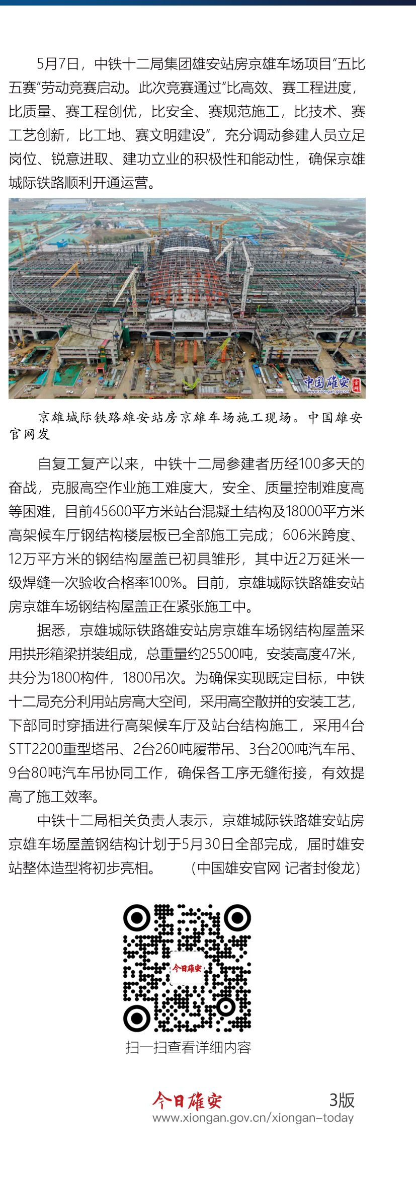 目前,京雄城际铁路雄安站房京雄车场钢结构屋盖正在紧张施工中。