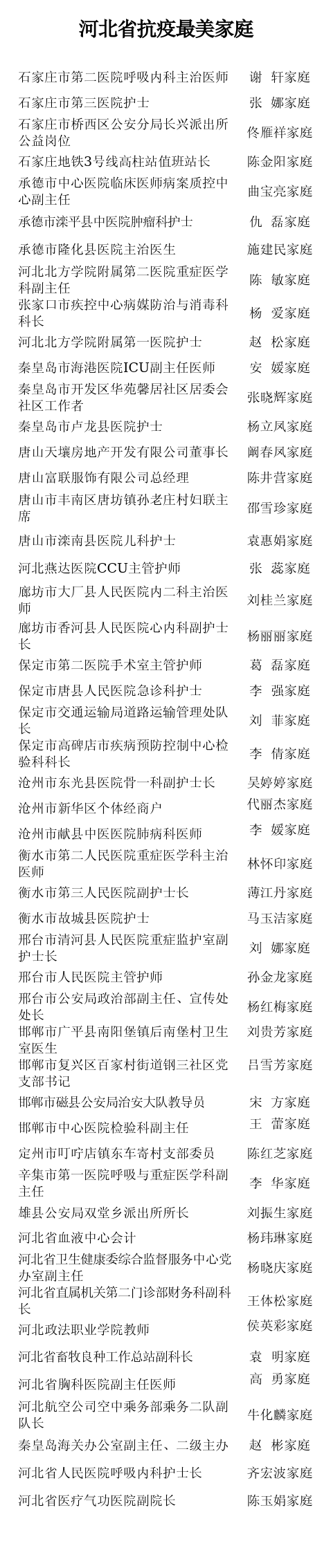 据悉,50个“河北省抗疫最美家庭”中,既有一线医务人员家庭、公安干警家庭,也有参与社区联防联控的家庭,从河北省众多优秀家庭中脱颖而出的100个“最美家庭”涵盖了爱岗敬业家庭、热衷公益家庭、助农致富家庭等各类家庭典型,他们以真实感人的事迹诠释了忠诚履职、勇于奉献、舍小家为大家的家国情怀,彰显了守望相助、爱老幼睦邻里的家庭美德,为全省广大家庭践行新时代家庭观、弘扬社会主义家庭文明新风尚作出了榜样。(河北日报记者卢旭东)