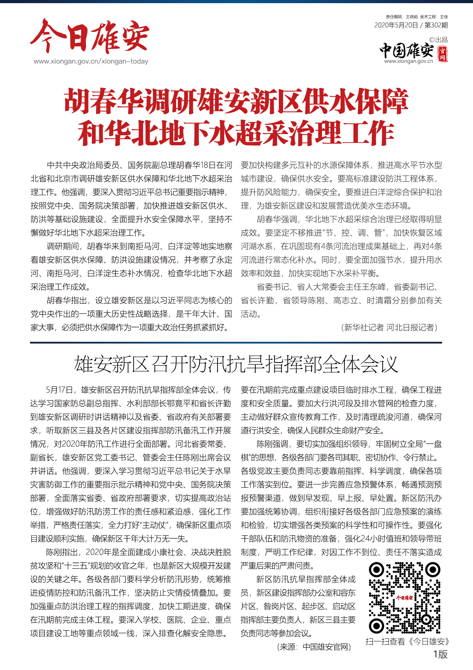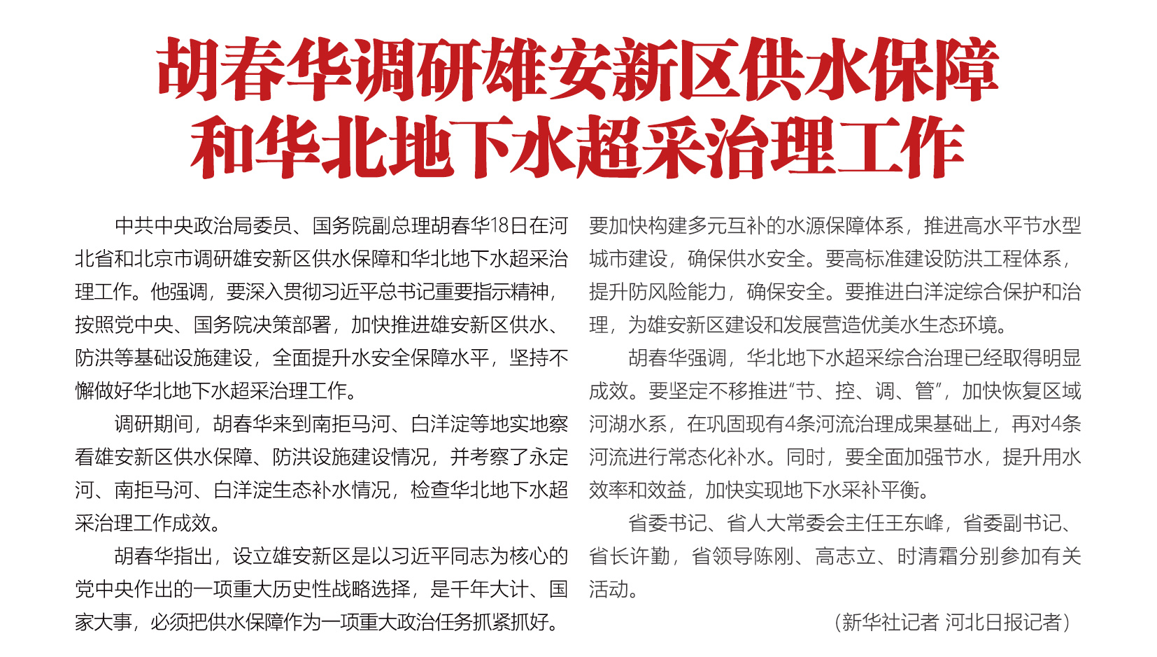 中共中央政治局委员、国务院副总理胡春华18日在河北省和北京市调研雄安新区供水保障和华北地下水超采治理工作。