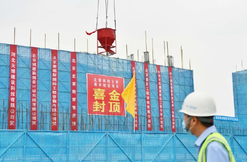 5月15日上午11时30分许,随着最后一方混凝土浇筑到位,建设历时227天的“三校一院”项目史家胡同小学雄安校区项目的教学楼、报告厅、风雨操场、行政楼、大门及操场主看台5座主体建筑全部顺利完成封顶。