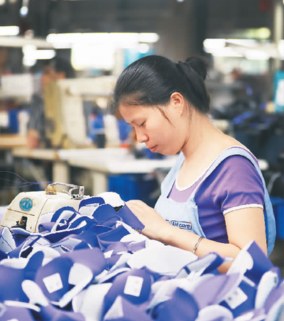 近期,江西省宜春市上高县工业园在做好疫情防控的同时,积极推进园区内各企业安全有序生产,开足马力,赶制国内外订单。图为上高县匹克(江西)实业有限公司员工正在赶制产品。陈旗海 摄(人民视觉)