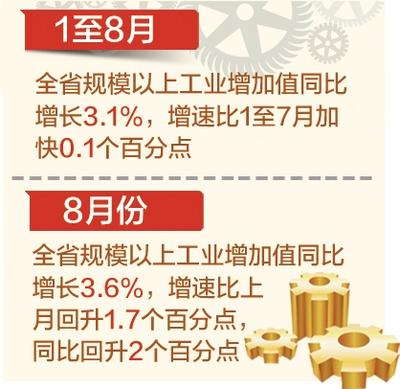 工业生产稳中向好。1至8月,全省规模以上工业增加值同比增长3.1%,增速比1至7月加快0.1个百分点。8月份,全省规模以上工业增加值同比增长3.6%,增速比上月回升1.7个百分点,同比回升2个百分点。