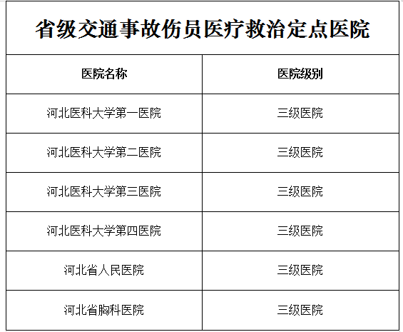 据悉,河北省公安厅与省卫生健康委确定河北省人民医院、河北省胸科医院、河北医科大学第一医院、河北医科大学第二医院、河北医科大学第三医院、河北医科大学第四医院等6家医院为省级道路交通事故救援定点医院,负责省内救治颅脑、心肺、肝脾等急危重症道路交通事故伤者的诊疗工作。并选拔聘请急诊科、骨科、神经外科、心脏外科、普外科、重症医学科等学科领域专业技能优秀、实践经验丰富的60名副高级以上医师组成专家库,负责指导和参与各地道路交通事故重伤员的医疗救治工作。各市、县公安机关、卫生健康行政部门也将分别确定本级交通事故救援定点医院,市级至少确定2家,县级至少确定1家,组建本地道路交通事故重伤员医疗救治专家库(组) 。