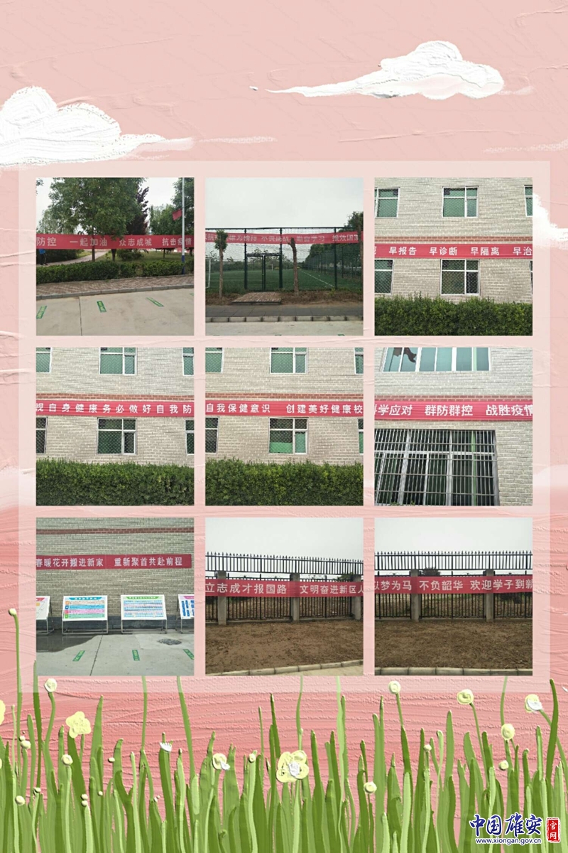 容城县征迁安置学校在校园内悬挂防疫宣传及正能量标语。中国雄安官网发