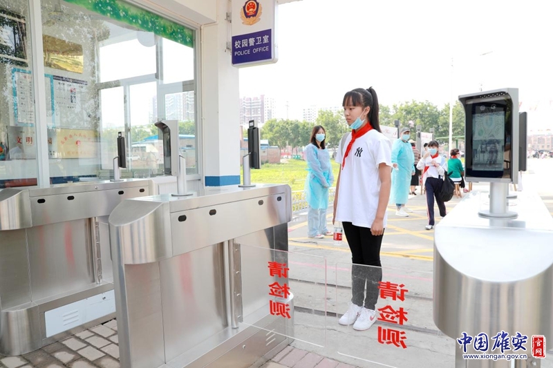6月1日早8时,安新县第二小学六年级学生经过红外线测控门进行体温测控和脸部识别。中国雄安官网记者李鑫 摄