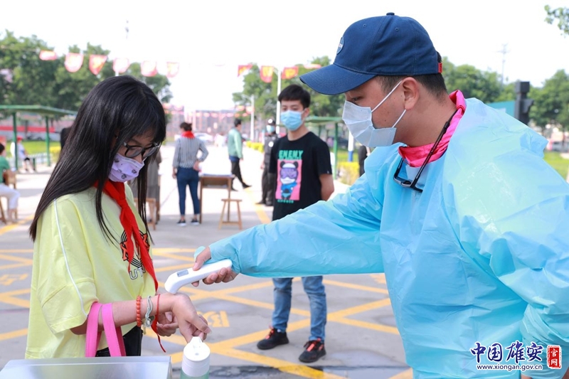 6月1日早8时,安新县第二小学工作人员对学生进行体温检测。中国雄安官网记者李鑫 摄