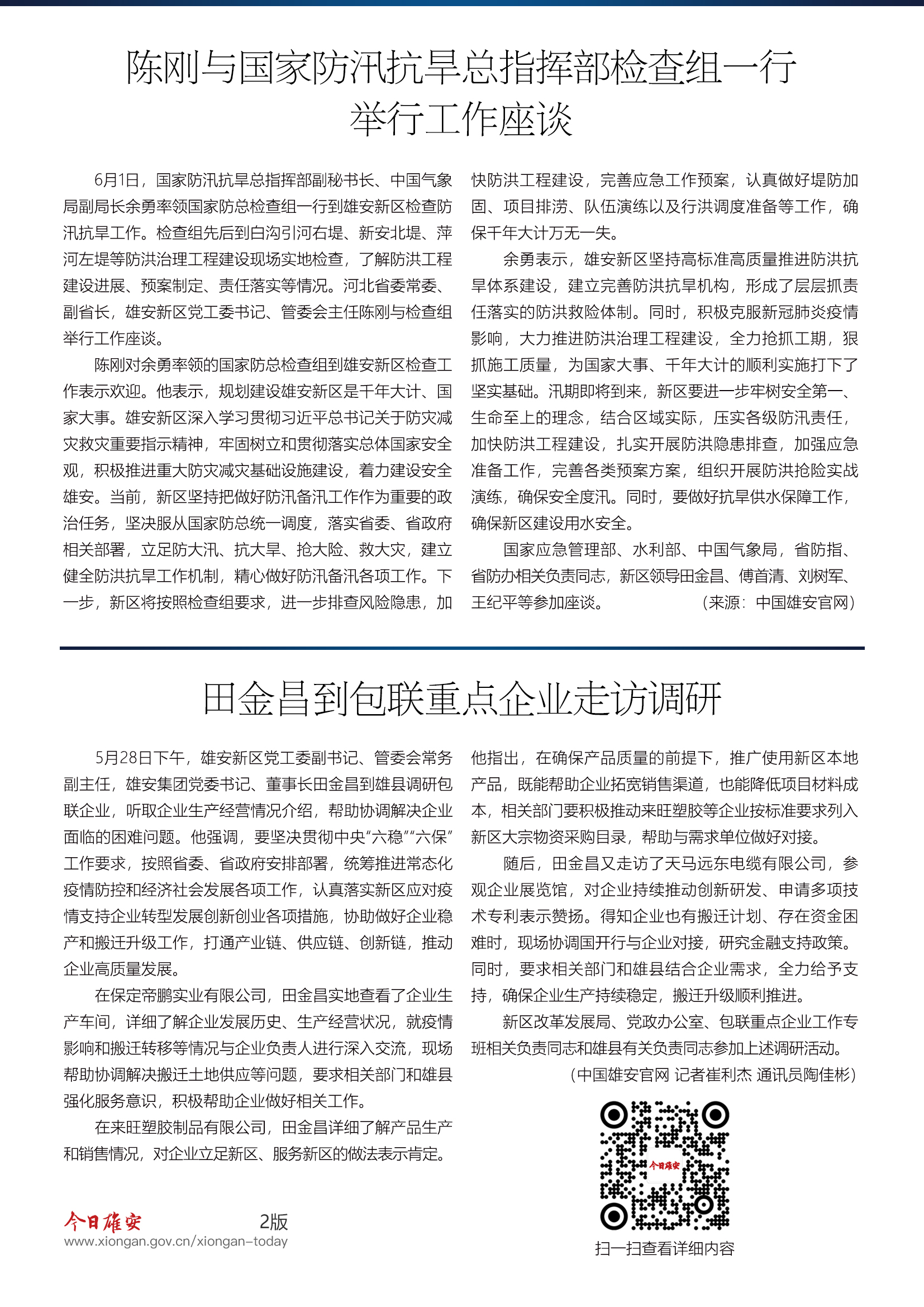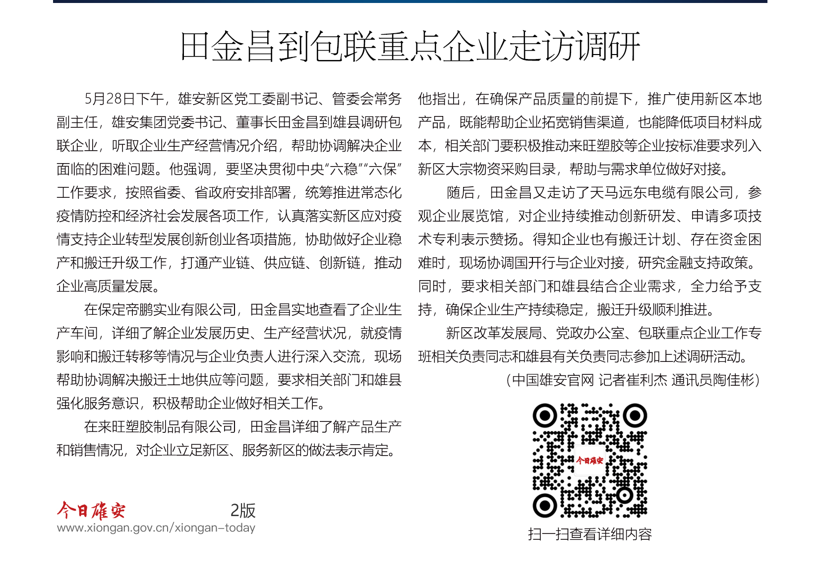 5月28日下午,雄安新区党工委副书记、管委会常务副主任,雄安集团党委书记、董事长田金昌到雄县调研包联企业,听取企业生产经营情况介绍,帮助协调解决企业面临的困难问题。