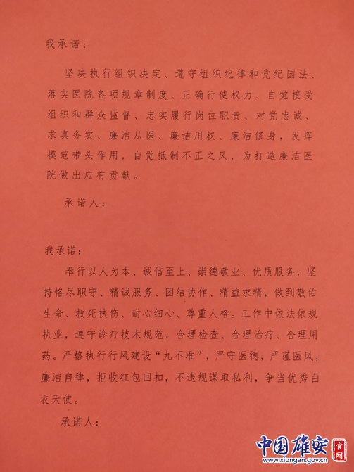 廉洁自律承诺书(样版)。安新县中医医院供图