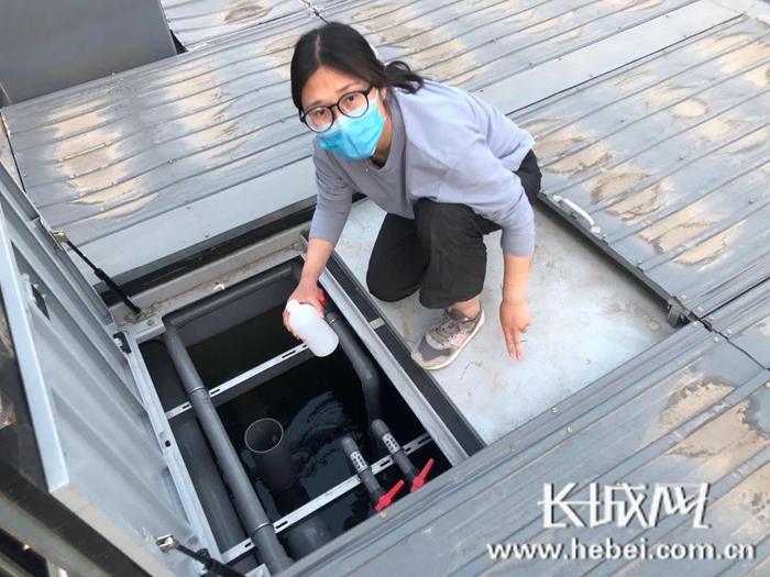 杨瑞正在赵北口镇北街村的污水处理站内抽取水样。