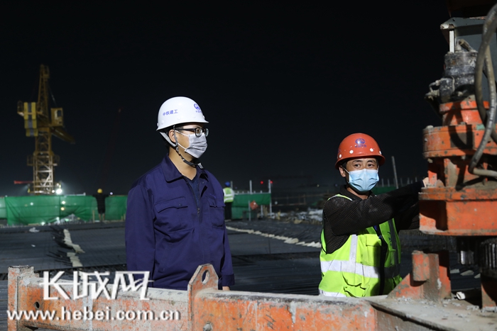 蔺文博(左)在雄安站津雄场承轨层混凝土浇筑的施工现场。