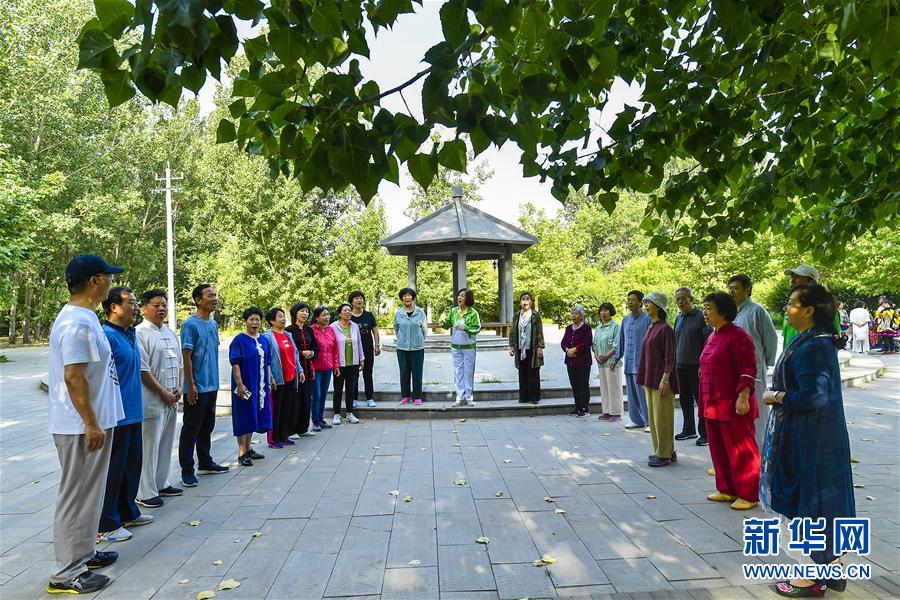 6月5日,市民在文安县水景公园内练习合唱。近年来,河北省文安县将植树造林与城市建设有机融合,探索“政府引导、企业运作、多方共赢”的市场化植树造林新模式,大规模推进国土绿化,打造人与自然和谐共生的优美生态环境,构筑京津雄绿色屏障。截至目前,该县森林覆盖率已经达到33%,城区绿地面积达到36.48%。新华社记者李晓果 摄