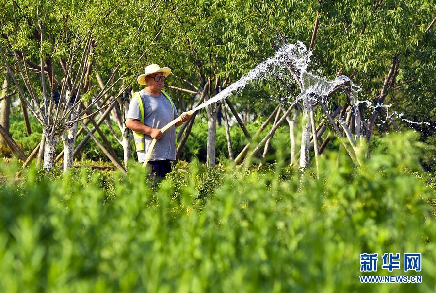 6月5日,在文安县迎宾大道,工人给花池浇水。近年来,河北省文安县将植树造林与城市建设有机融合,探索“政府引导、企业运作、多方共赢”的市场化植树造林新模式,大规模推进国土绿化,打造人与自然和谐共生的优美生态环境,构筑京津雄绿色屏障。截至目前,该县森林覆盖率已经达到33%,城区绿地面积达到36.48%。新华社记者李晓果 摄