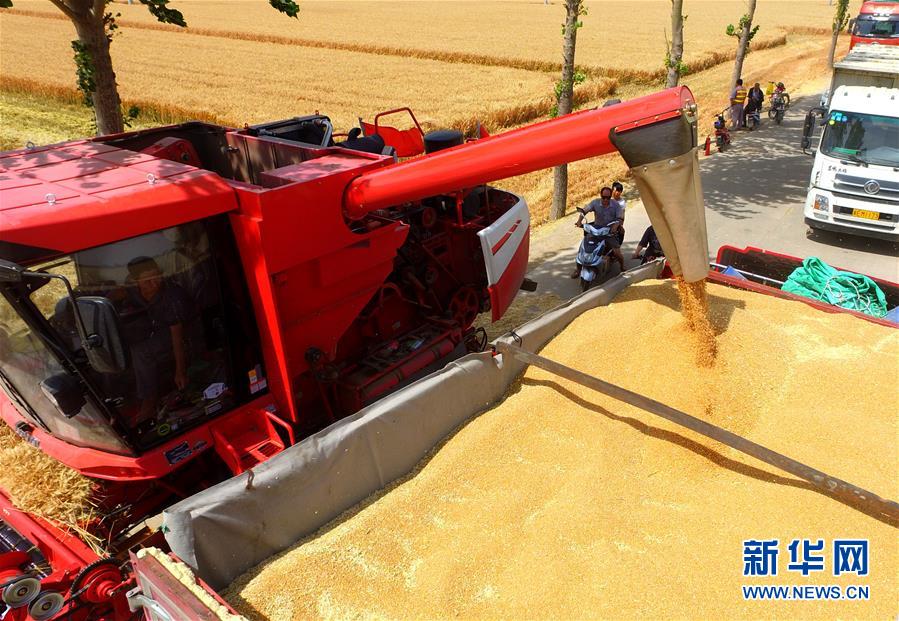 6月8日,在河北省南和县闫里乡闫里村,农民将收获的小麦装车(无人机照片)。“三夏”期间,河北省预计组织和调度小麦联合收割机、拖拉机、夏玉米播种机等200万台农业机械投入作业。新华社记者 朱旭东 摄