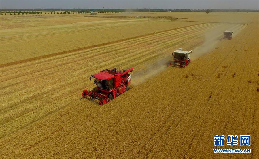 6月8日,联合收割机在河北省南和县闫里乡闫里村麦田进行夏收作业(无人机照片)。“三夏”期间,河北省预计组织和调度小麦联合收割机、拖拉机、夏玉米播种机等200万台农业机械投入作业。新华社记者 朱旭东 摄