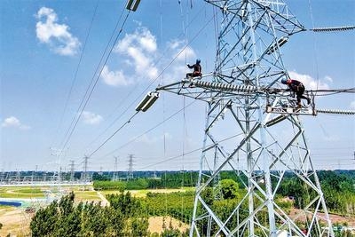近日,河北送变电施工人员在进行京雄高铁雄安220千伏牵引站配套线路的挂线作业。国网河北电力按下雄安电网建设的“快进键”,加紧推进张北-雄安特高压输变电工程、雄安新区220千伏剧村变电站和110千伏河西变电站等项目建设。(记者赵杰 摄)