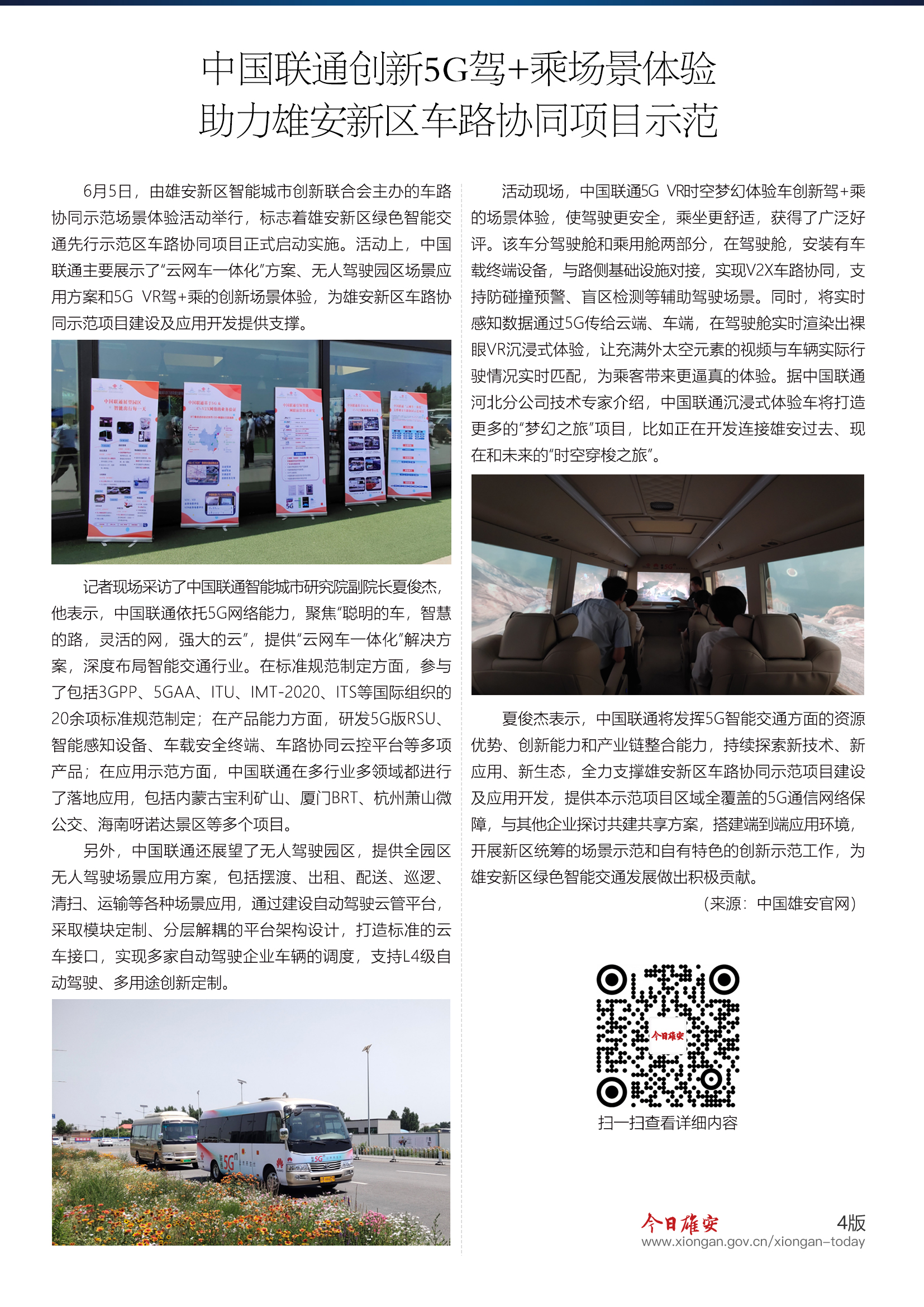 中国联通创新5G驾+乘场景体验助力雄安新区车路协同项目示范