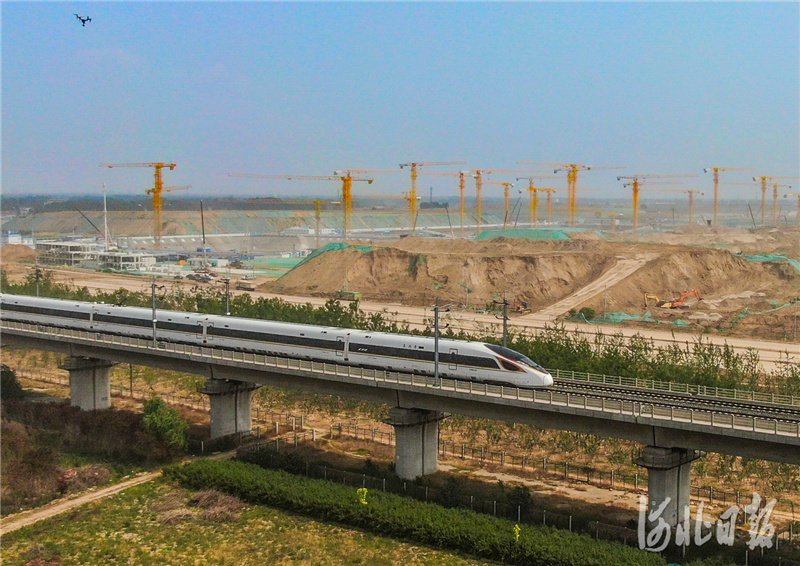 “复兴号”动车组从雄安新区正在建设中的容东片区旁驶过。容东片区将努力打造成为宜居宜业新城区、协调融合先行区、绿色智能示范区。河北日报记者赵杰摄影报道