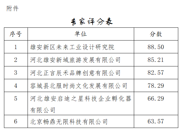 6月15日,雄安新区公共服务局组织召开河北雄安新区第二届文创和旅游商品创意设计大赛方案专家评审会。来自河北博物院、河北省旅游协会、河南博物院、雄安新区公共服务局及改革发展局等单位的7位专家组成评审小组,依据统一的评分标准和规则对符合响应条件的6家方案进行了专家评审。最终雄安新区未来工业设计研究院的方案获得88.50分,排名第一,获得承办雄安新区第二届文创和旅游商品创意设计大赛资格。