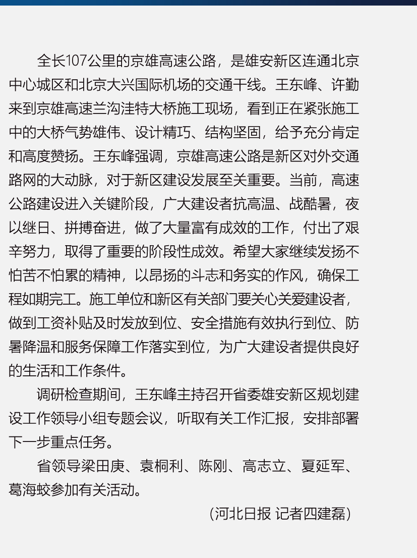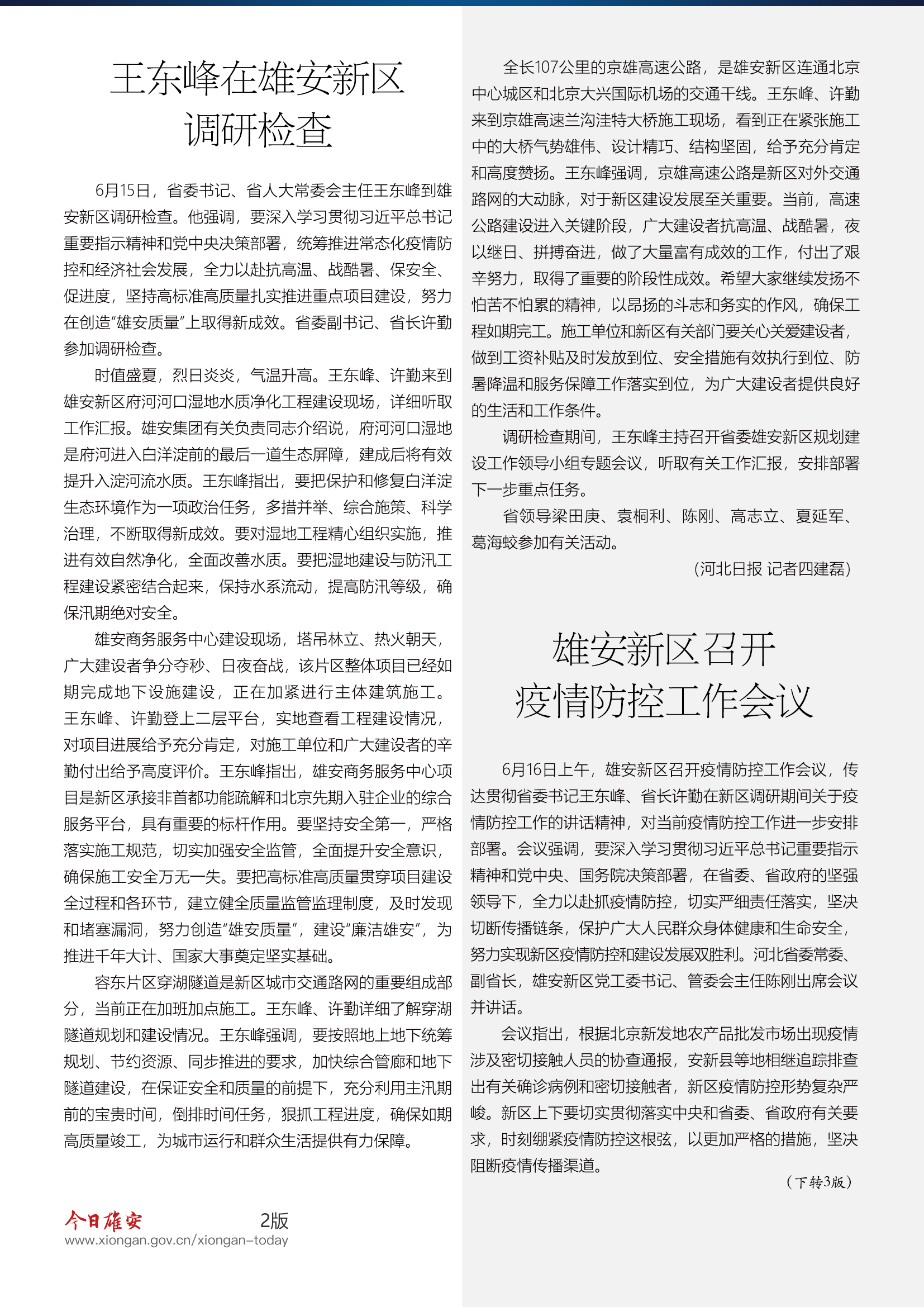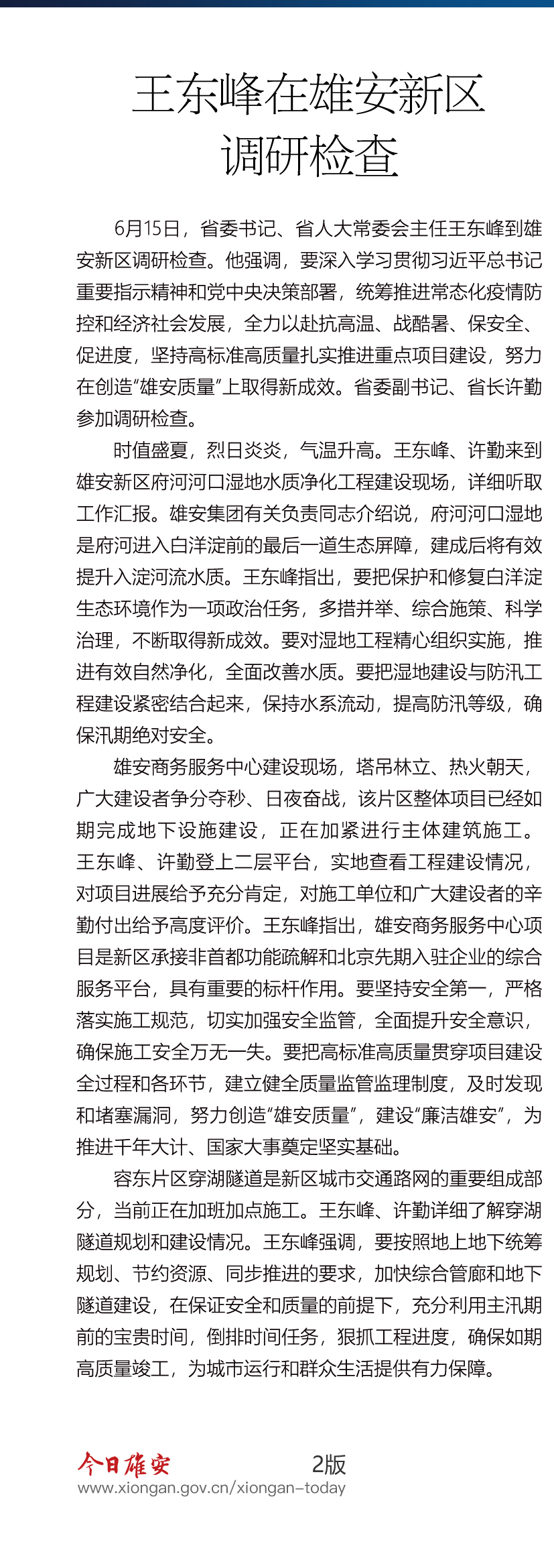 6月15日,省委书记、省人大常委会主任王东峰到雄安新区调研检查。
