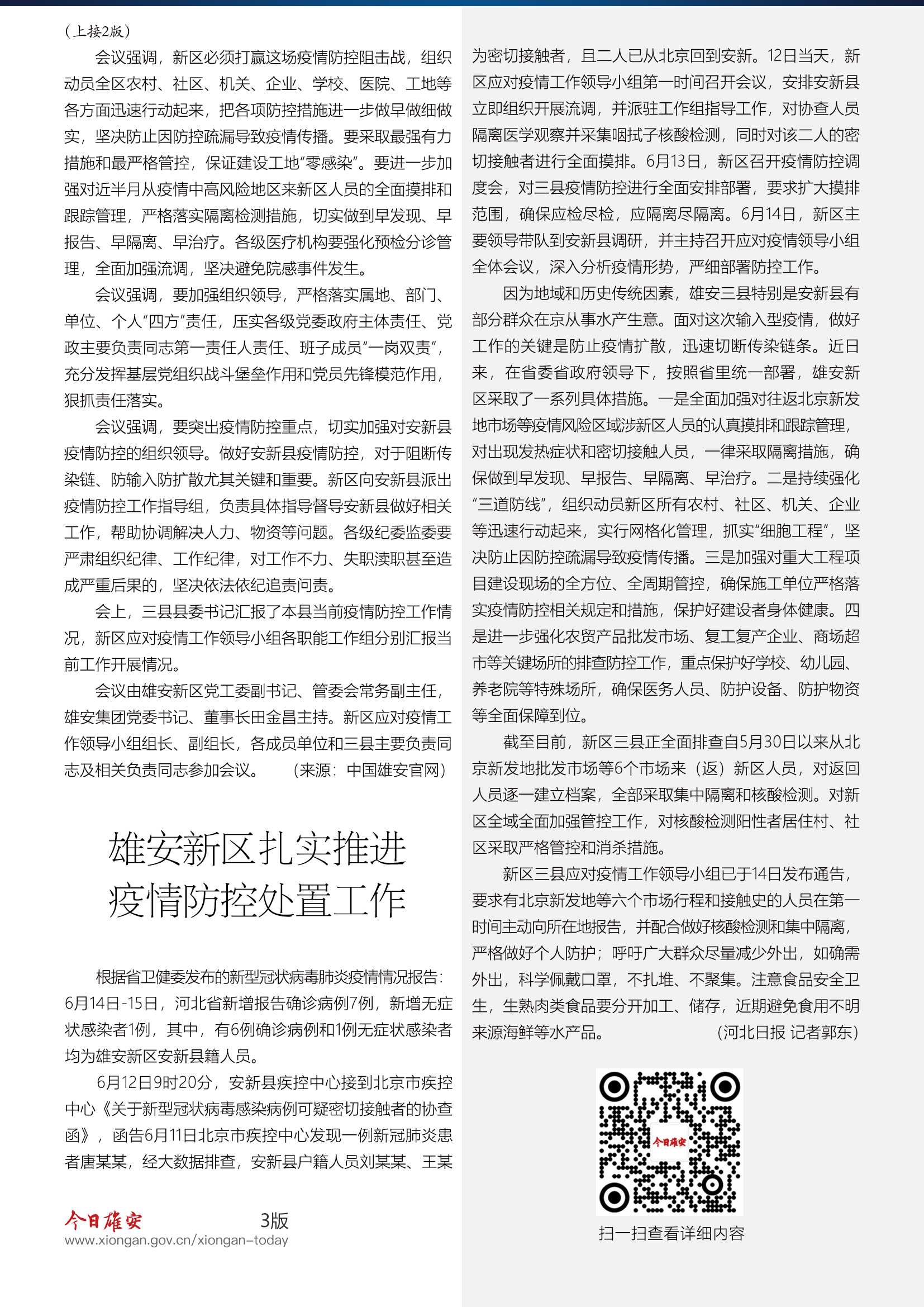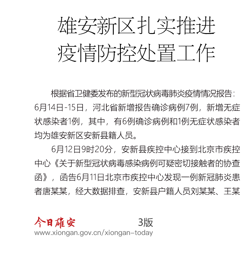 2020年6月15日0—24时,河北省新增报告新型冠状病毒肺炎确诊病例4例,其中,雄安新区安新县3例,定州市1例。