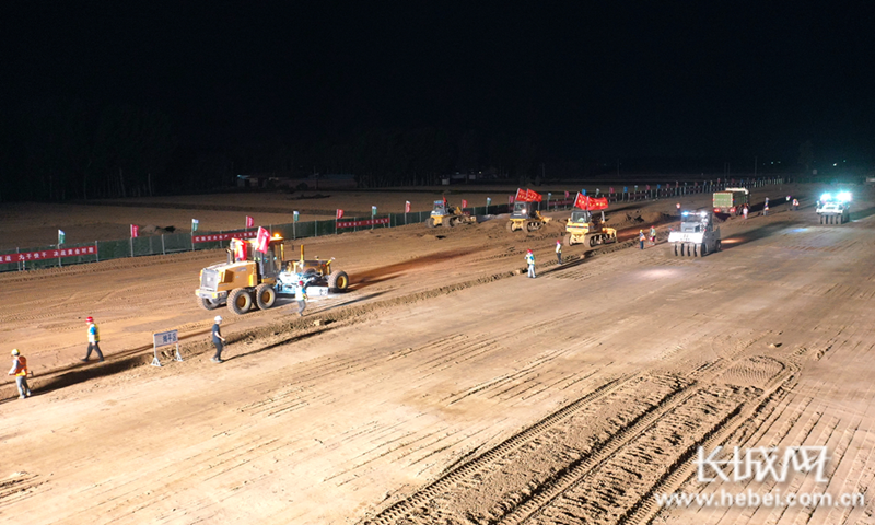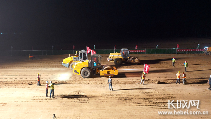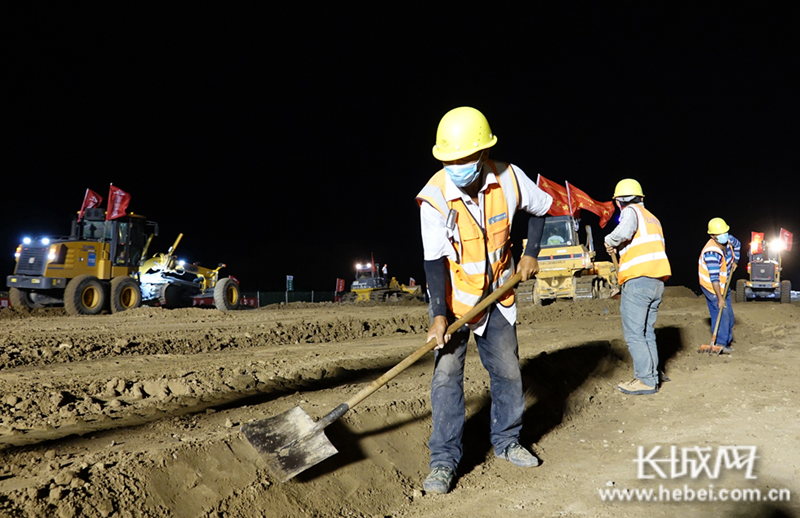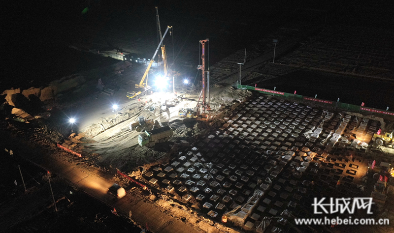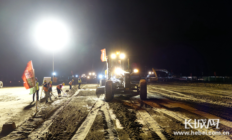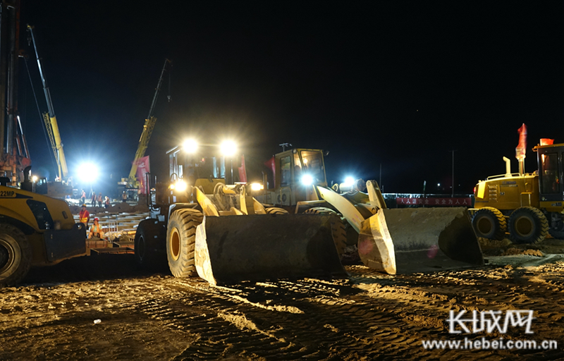在京雄高速公路(河北段)三标段施工现场,施工人员、机械设备正在挑灯夜战,加班加点搞建设。霍少轩 摄