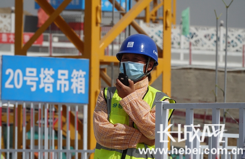 雄安商务服务中心项目的建筑工人拿对讲机对吊塔进行指挥。霍少轩 摄