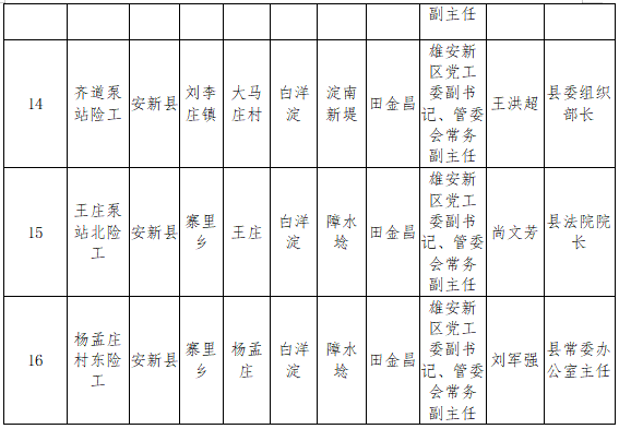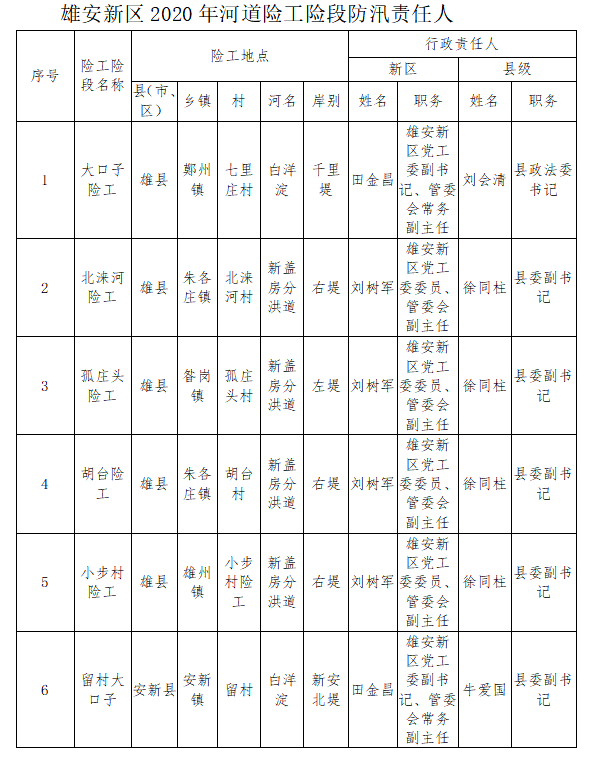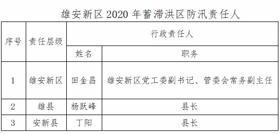 为切实做好2020年防汛抗洪工作,履行防汛责任,推动防汛各项任务有效落实,根据《中华人民共和国防洪法》和新区防汛抗旱指挥部要求,结合新区实际,现对2020年新区蓄滞洪区、险工险段防汛行政责任人进行公示,接受社会监督。