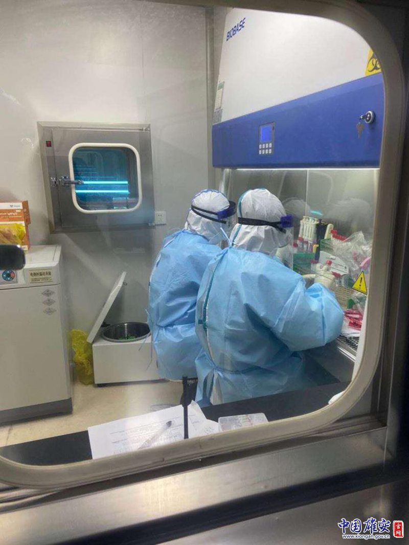 容城县人民医院核酸检测实验室检验人员正在进行核酸检测工作。中国雄安官网发