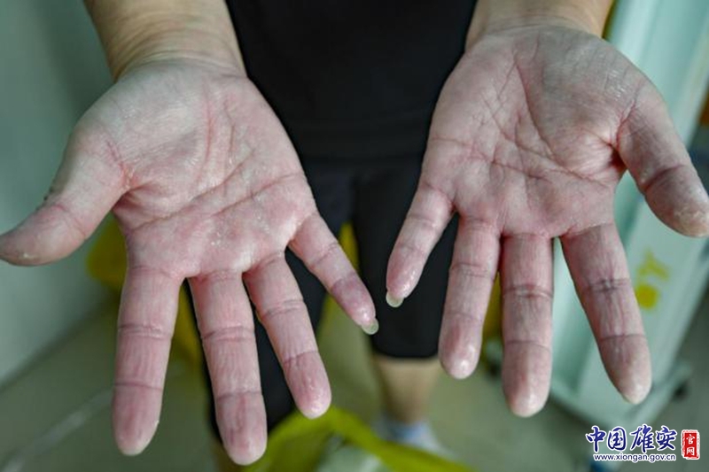 医务人员双手被汗水浸得发白起皱。中国雄安官网记者靳新平 摄
