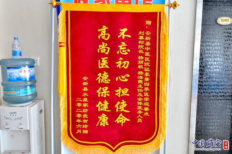 在豪景四季集中隔离医学观察点工作区的墙壁上悬挂着一面“不忘初心担使命,高尚医德保健康”的锦旗。送这面锦旗的是安新县一家专卖店的经营人员。因在留观期间受到医护人员无微不至的照顾,又亲眼目睹了身着防护服的医护人员为他们服务的危险与艰辛,便联系亲戚制作了一面锦旗,以表达他们对医护人员的真诚谢意。
