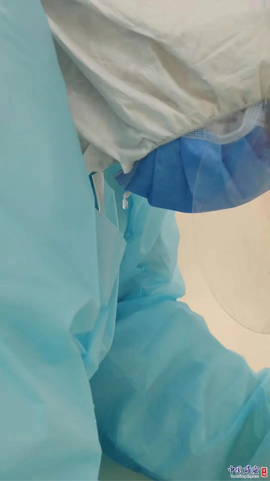 安新县医院医护人员的汗水顺着口罩滴落。安新县医院供图