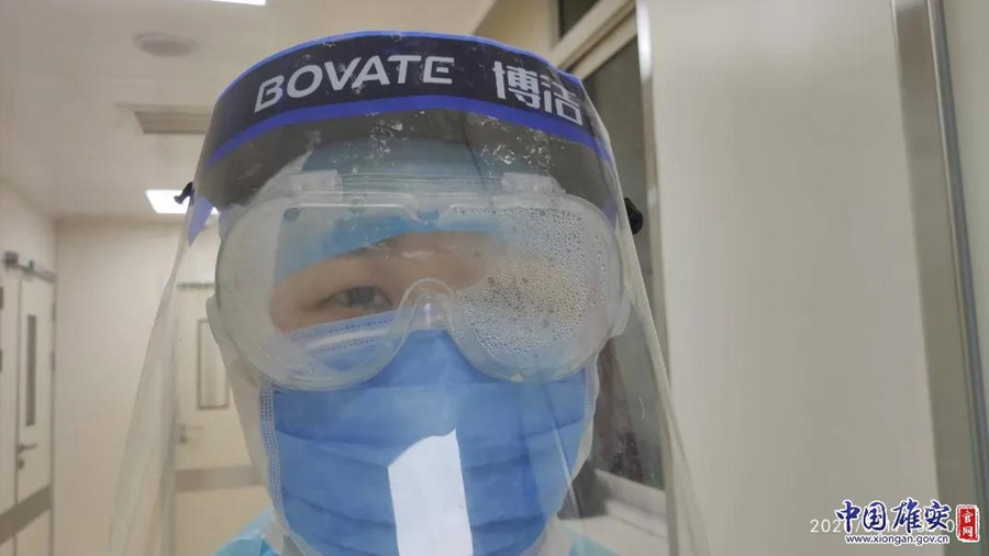 战“疫”一线的安新县医院医护人员护目镜因雾气变得模糊。安新县医院供图