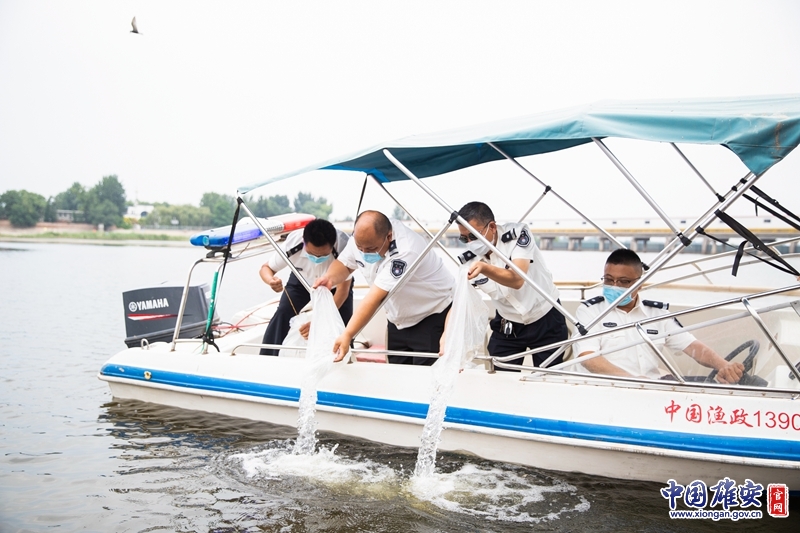 雄县农业农村局同志进行鱼苗投放。中国雄安官网记者牛思佳 摄